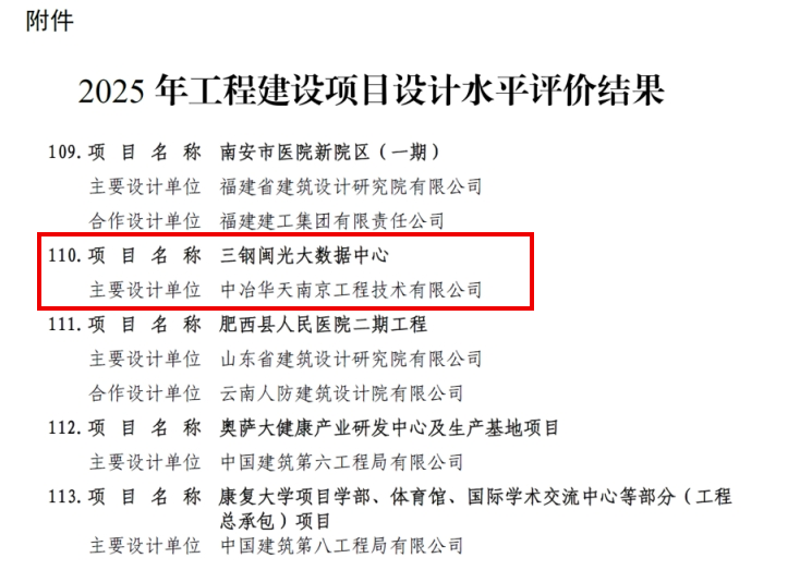 近日,中國施工企業(yè)管理協(xié)會正式公布2025年工程建設項目設計水平評價結果,中冶華天建筑設計研究院設計的三鋼閩光大數據中心項目榮獲三等獎。這是中冶華天在國家級行業(yè)獎項上的又一大突破,集中展現了其過硬的技術實力和卓悅的品質追求,在建筑設計領域再次唱響“中冶華天 綠色明天”品牌之歌。